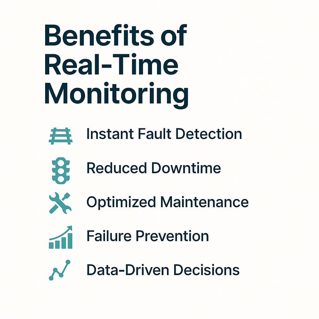 Using IoT-enabled devices and intelligent analytics, real-time monitoring transforms raw data into instant insights—allowing railway personnel to stay ahead of failures, not just react to them.